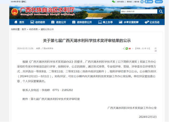 此次广西天湖水利科学技术奖奖励工作办公室从众多评选项目中评选出一等奖8项、二等奖11项、三等奖13项,我司参与完成的《小型水库雨水情测报和大坝安全监测关键技术及应用》经过激烈的角逐,斩获一等奖。